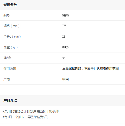 產(chǎn)品名字:世達(dá)5件套6.3MM系列25mm長(zhǎng)中孔花型旋具頭T25